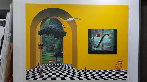 프랑스 파리에서 오래 유학한 작가는 동서양의 서로 다른 사고체계가 자유롭게 만나는 초현실적 공간을 즐겨 그린다. 격자바탕의 바닥 그림으로 서양화의 원근법을 강조한 화면에 동양화풍의 나무 한그루를 중앙에 배치해 동서양의 조화를 한 화면에 담아내는 식이다.