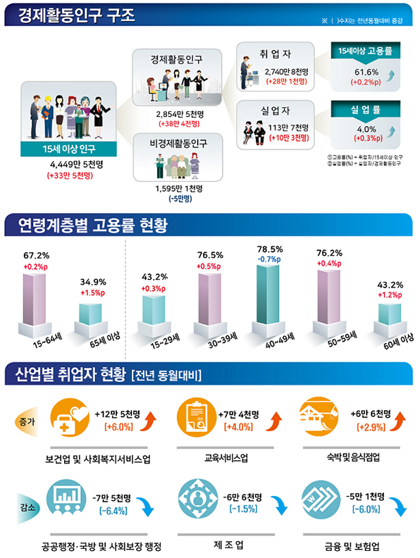 종사상 지위별로는 임금근로자 중 상용근로자가 38만 8000명(2.8%), 일용근로자가 6000명(0.4%) 각각 증가했으며 임시근로자는 8만 5000명(-1.7%) 감소했다.