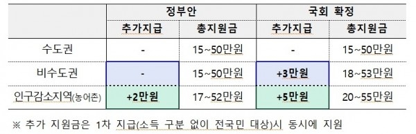 아울러, 1조 9000억 원을 증액해 비수도권과 인구감소지역에 거주하는 모든 주민에게 3만 원을 추가로 지원한다.