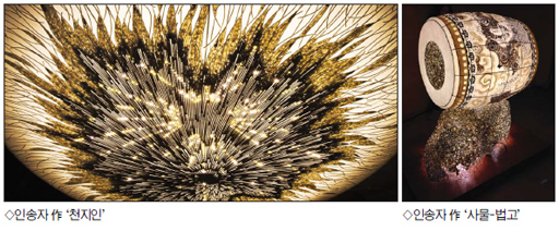 한지·금속·목재 등 다양한 재료를 자유자재로 구사해 작품을 선보이는 인송자 작가의 환상적인 한지조형등 15점이 전시된다.