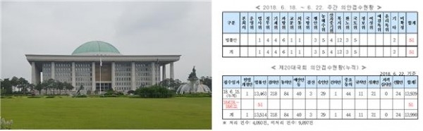 <정치부=정완태 기자> 국회사무처(사무총장 김성곤)는 2018년 6월 넷째 주[6. 18(월)∼6. 22(금)]에 총 51건의 의안이 접수되었다고 밝혔다. 의안종류별로 구분하면, 법률안 51건(의원발의 50건, 정부제출 1건)이다. 접수된 의안은 소관 위원회에 회부되어 심사될 예정이다.
