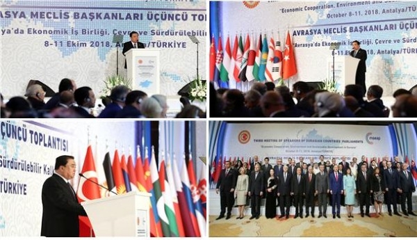 2016년 제1차 모스크바 회의, 2017년 제2차 서울 회의에 이어 <제3차 유라시아 국회의장회의>를 아름답고 유서깊은 지중해 연안도시인이 곳 안탈리아에서 터키 국회 및 러시아 하원과 공동으로 개최하게 된 것을 매우 기쁘고 영광스럽게 생각합니다.