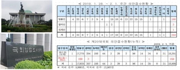 <정치부=정완태 기자> 국회사무처(사무총장 유인태)는 2019년 1월 다섯째 주[2019년 1. 28(월) ∼ 2. 1(금)]에 총 154건의 의안이 접수되었다고 밝혔다. 의안종류별로 구분하면, 법률안 150건(의원발의 149건, 정부제출 1건), 결의안 3건, 징계안 1건이다. 접수된 의안은 소관 위원회에 회부되어 심사될 예정이라고 하였다.