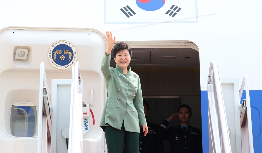 박근혜 대통령이 25일 오전 아프리카 3개국과 프랑스 국빈 방문을 위해 성남 서울공항에 도착, 전용기에 올라 손을 흔드고 있다.(사진=청와대)