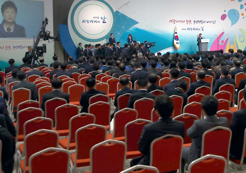 (사진설명=박근혜 대통령이 어제 오전 부산 해운대구 벡스코에서 열린 제4회 지방자치의날 기념식에서 축사를 하는 가운데, 뒷줄에 많은 좌석들이 비어 있다.)