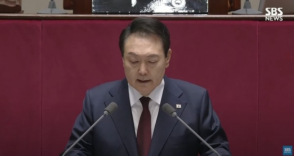 윤석열 대통령이 25일 오전 국회 본회의장에서 2023년도 예산안 및 기금운용계획안 시정연설을 하고 있다. (사진=SBS뉴스 캡처)