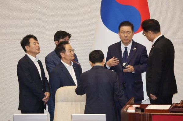예결위 의결 뒤 국민의힘 의원들이 본회의장에 하나둘 모습을 드러낼 때에도 민주당은 의원총회를 이어갈 뿐 별다른 입장을 내지 않았다.