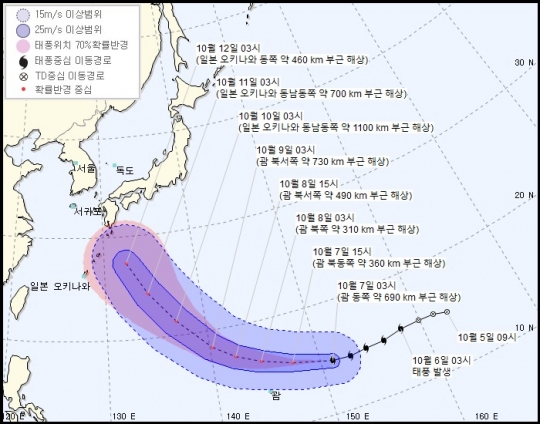 태풍은 현재 매우 강하고 빠르게 세력을 키우며 한반도 쪽으로 접근하고 있다. 기상청은 태풍이 8일 오후 강도 ‘매우 강’으로 힘을 키운 뒤 일본 오키나와 동쪽 약 460㎞ 부근 해상에 도착하는 오는 12일까지 그 세력을 유지할 것으로 내다봤다. 윤기한 기상청 사무관은 “올해 들어 발생한 태풍 중 이번 태풍이 이동 중 가장 강하고 규모도 가장 크게 발달할 가능성이 크다”며 “해수면 온도가 30도인 곳을 계속 거치면서 강하게 발달할 것으로 보인다”고 말했다.